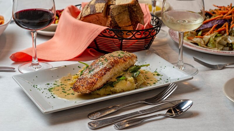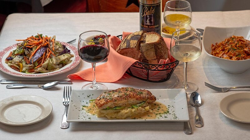 Multiple appetizers with a basket of bread accompanied with white and red wine